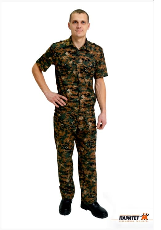 Рубашка: мужская с центровой бортовой застежкой на 8 петель и пуговиц, 2 из которых на поясе, с 2-я верхними накладными карманами с застроченными защипами, имитирующими планку и и фигурными клапанами, застегивающимися на пуговицы, воротник втачной, отложной с притачной стойкой, В области плечевых швов пагоны, рукава втачные двухшовные короткие с цельнокроенными декоративными манжетами, низ рубашки с цельнокроеным поясом, стянутым в области боковых швов эластичной лентой.