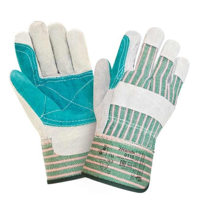 Перчатки 2Hands - для защиты от механических воздействий.выполнены из плотной хлопковой ткани со спилком КРС сорта АВ, дополнительный слой спилка на ладони и пальцах, усиленная жесткая крага, флисовая подкладка на ладонной части. Мягкий спилок сорта АВ (1,2 мм +/– 0,2 мм), двойные швы.